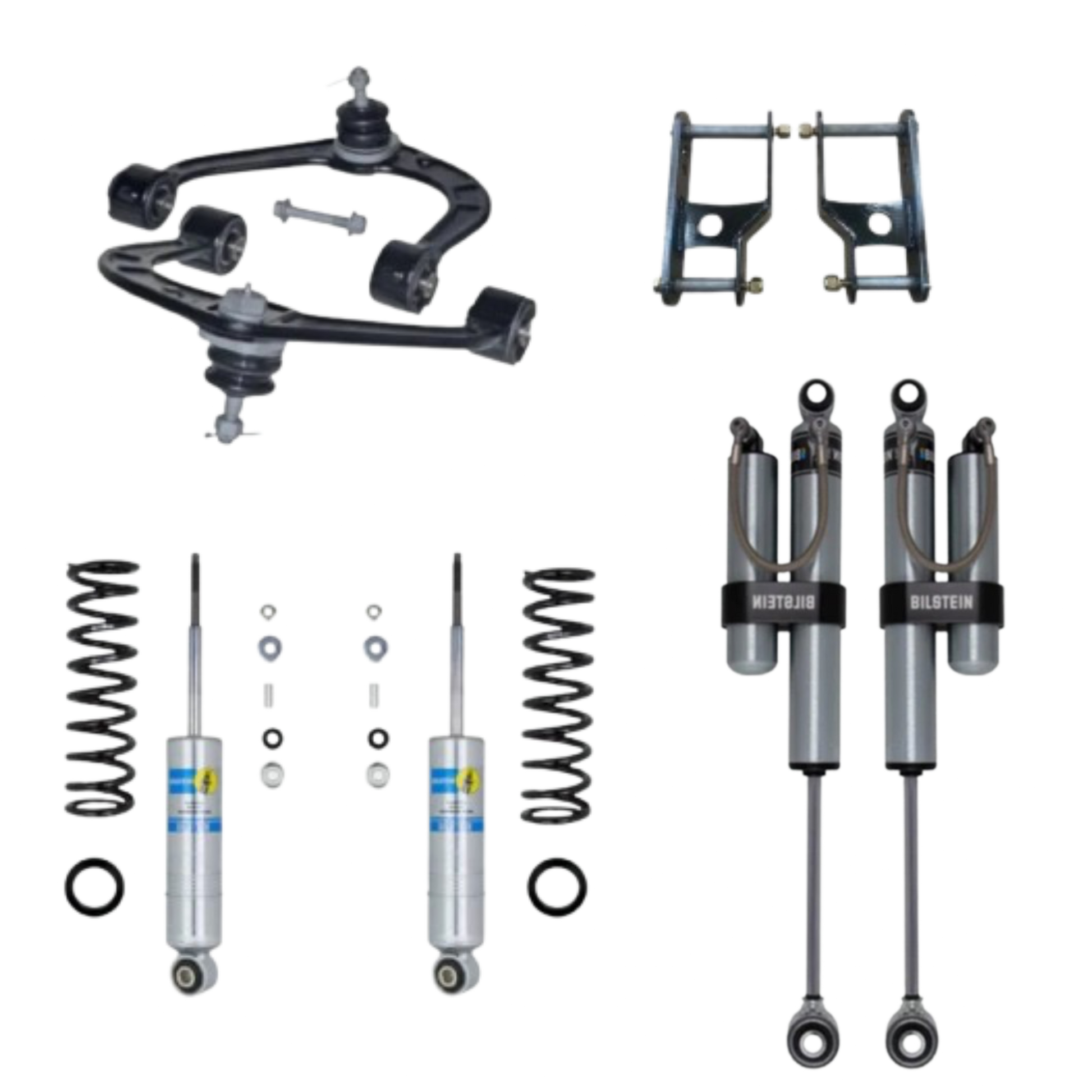 SPC adjustable upper control arms, Bilstein 6112 front struts and springs, Bilstein 5160 external reservoir rear shock absorbers, and rear lift shackles.