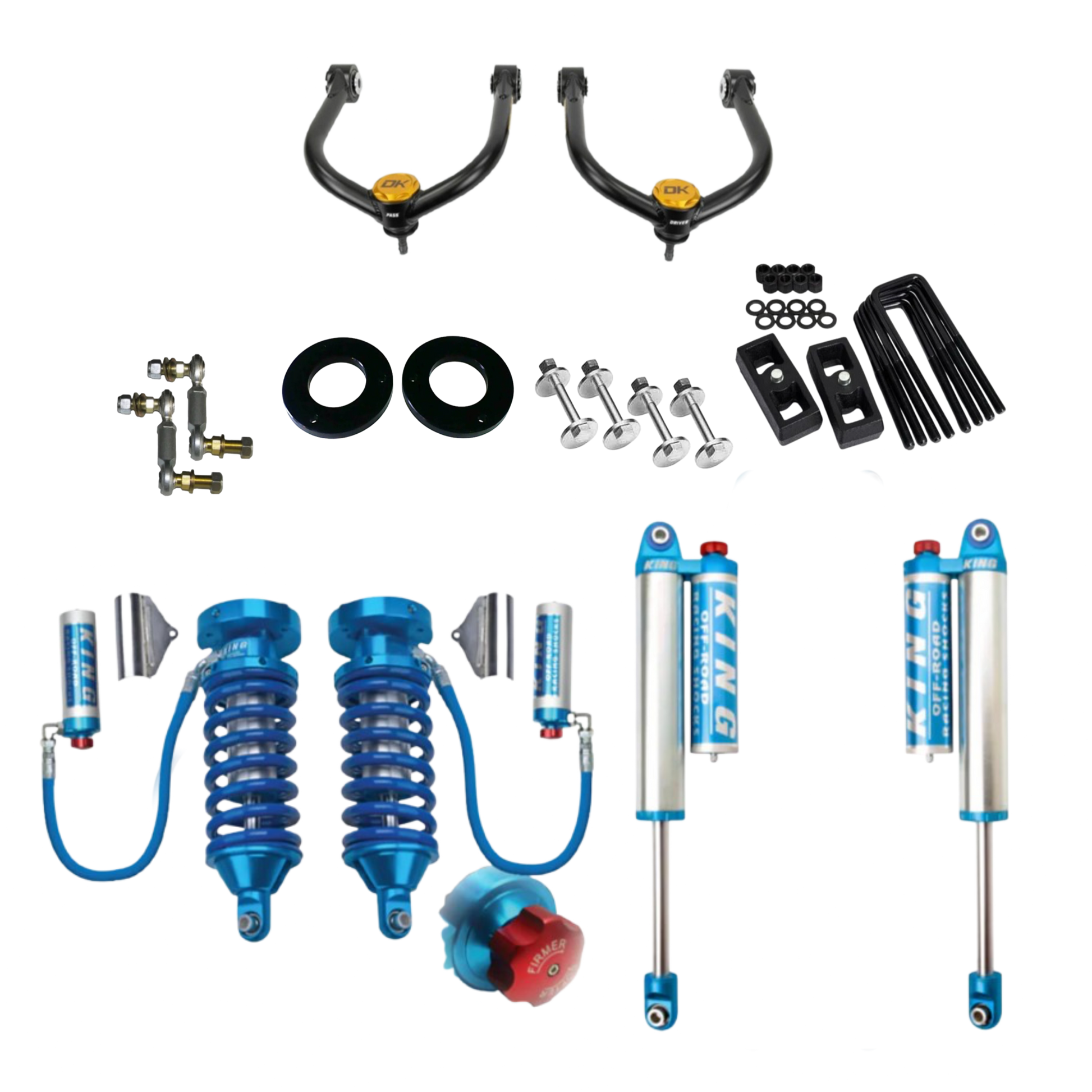 - King coilovers with dampening knobs, a 2.5" body spring loaded option that will provide a soft plush ride quality. Adjust firmness and softness with the twist of a knob.